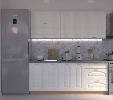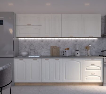 Prețul inițial a fost: 4.590,00 lei.3.900,00 leiPrețul curent este: 3.900,00 lei. TVA inclusBucătărie Maria Clasic NEW MDF Alb Fibră 2,6m C0