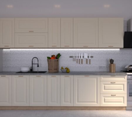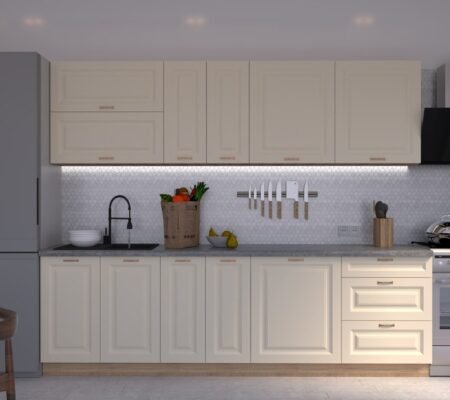 Prețul inițial a fost: 5.965,00 lei.5.070,00 leiPrețul curent este: 5.070,00 lei. TVA inclusBucătărie Maria Chenar MDF Vanilie Soft 2,6m HC