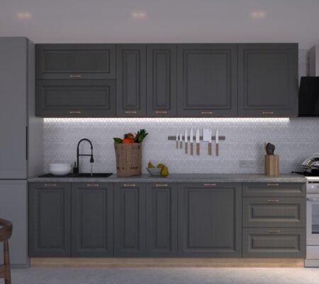 Prețul inițial a fost: 5.965,00 lei.5.070,00 leiPrețul curent este: 5.070,00 lei. TVA inclusBucătărie Maria Chenar MDF Grafit Fibră 2,6m HC