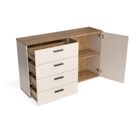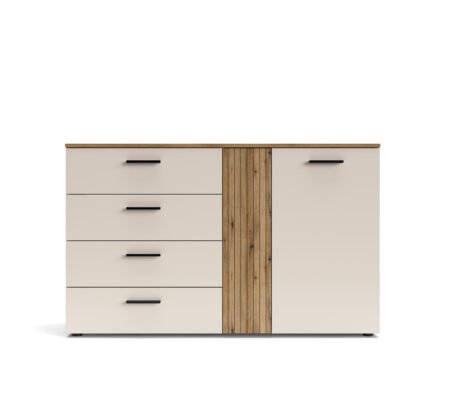 Prețul inițial a fost: 890,00 lei.660,00 leiPrețul curent este: 660,00 lei. TVA inclusComoda modernă 1 Usa 4 Sertare, riflaj decorativ, Casmir, FERO, 139 cm