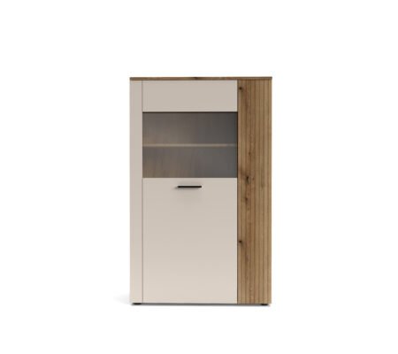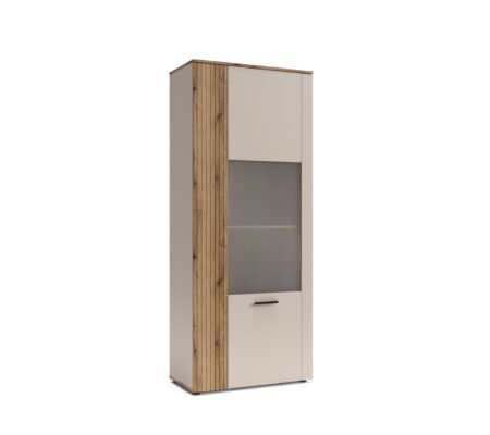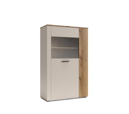 Prețul inițial a fost: 700,00 lei.490,00 leiPrețul curent este: 490,00 lei. TVA inclusVitrina inalta eleganta, 2 usi sticla, dulapuri si sertar, Casmir, VALNERA, 94 cm