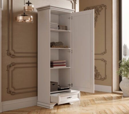 Prețul inițial a fost: 2.300,00 lei.1.210,00 leiPrețul curent este: 1.210,00 lei. TVA inclusDulap living stil clasic provensal, usa si sertar, Alb, ELORA, 70 cm