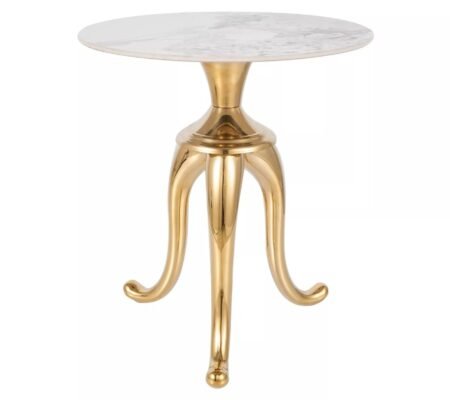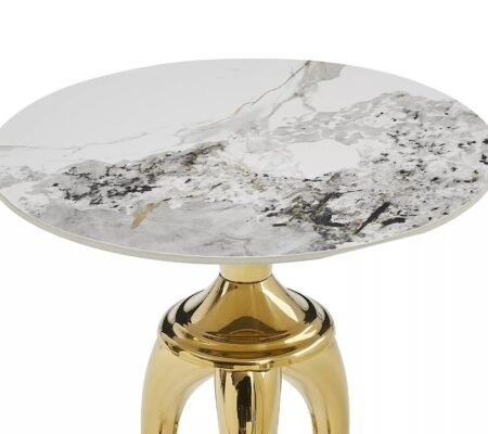 Prețul inițial a fost: 1.000,00 lei.851,00 leiPrețul curent este: 851,00 lei. TVA inclusMasuta cafea SNAKE, alb cu efect de marmura/auriu, ceramica/metal, 48×55 cm