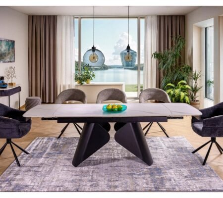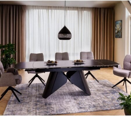 Prețul inițial a fost: 4.690,00 lei.3.428,00 leiPrețul curent este: 3.428,00 lei. TVA inclusMasa extensibila dining ARMANDO, negru cu efect de marmura, ceramica/metal, 160/240x90x76 cm