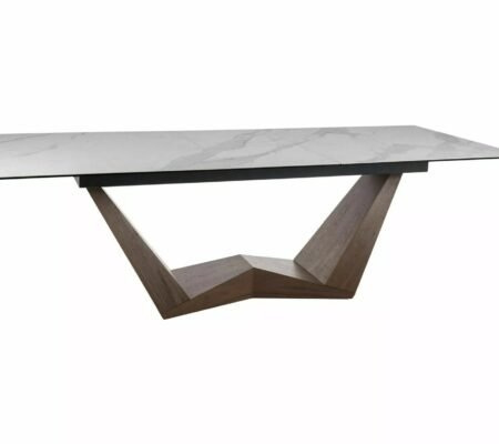 Prețul inițial a fost: 4.300,00 lei.3.813,00 leiPrețul curent este: 3.813,00 lei. TVA inclusMasa extensibila dining BONUCCI, alb cu efect de marmura/nuc, sticla/ceramica/furnir, 200/250x98x76 cm
