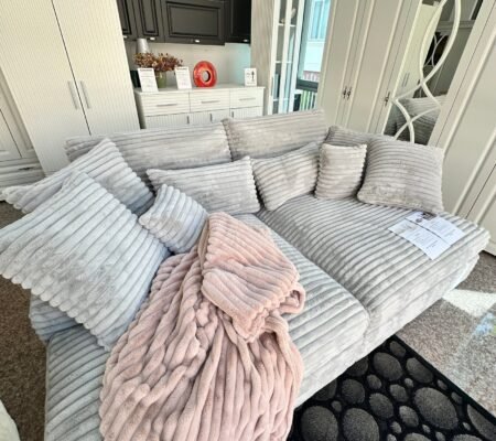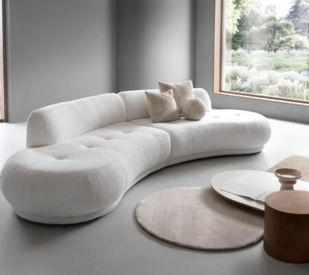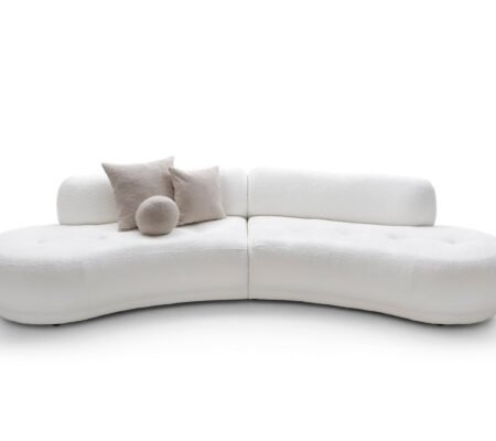 Prețul inițial a fost: 6.000,00 lei.5.100,00 leiPrețul curent este: 5.100,00 lei. TVA inclusCanapea GIOEYA in formă de semiluna, material boucle fin, culoare alb, 350 cm