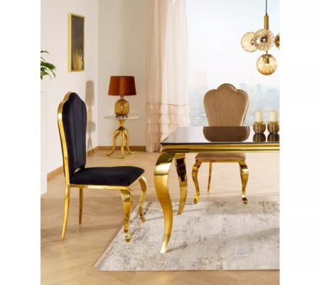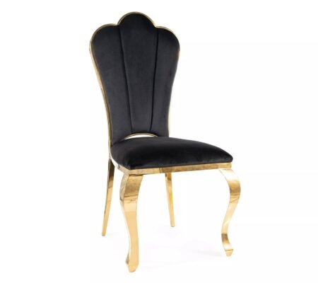 Prețul inițial a fost: 580,00 lei.466,00 leiPrețul curent este: 466,00 lei. TVA inclusScaun dining QUEEN Velvet, negru/auriu, stofa catifelata/metal, 53x59x111 cm
