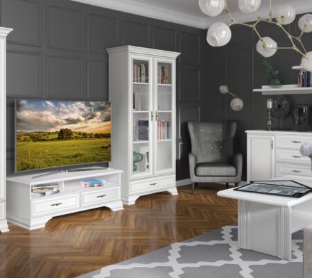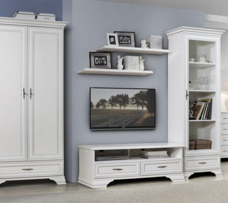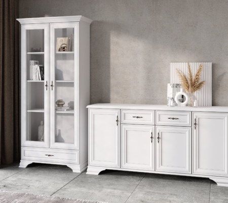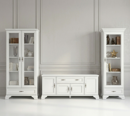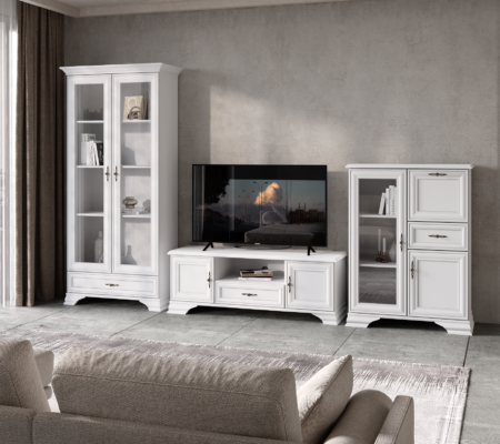 Prețul inițial a fost: 6.090,00 lei.3.700,00 leiPrețul curent este: 3.700,00 lei. TVA inclusSet living stil clasic provensal, Varianta 5, vitrina si comoda, Alb, ELORA, 285 cm