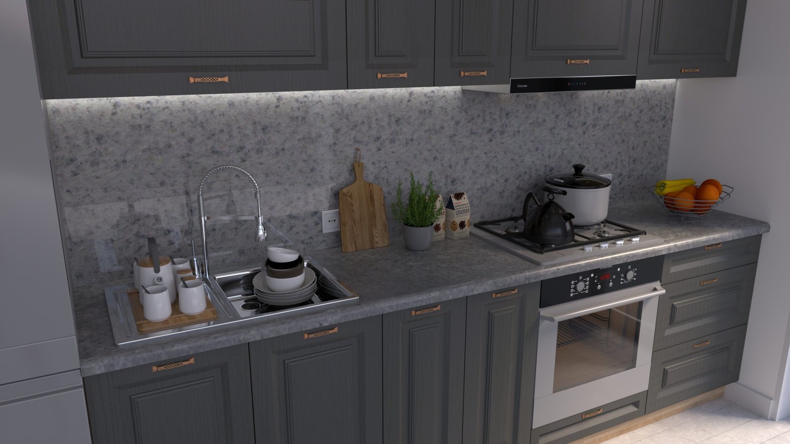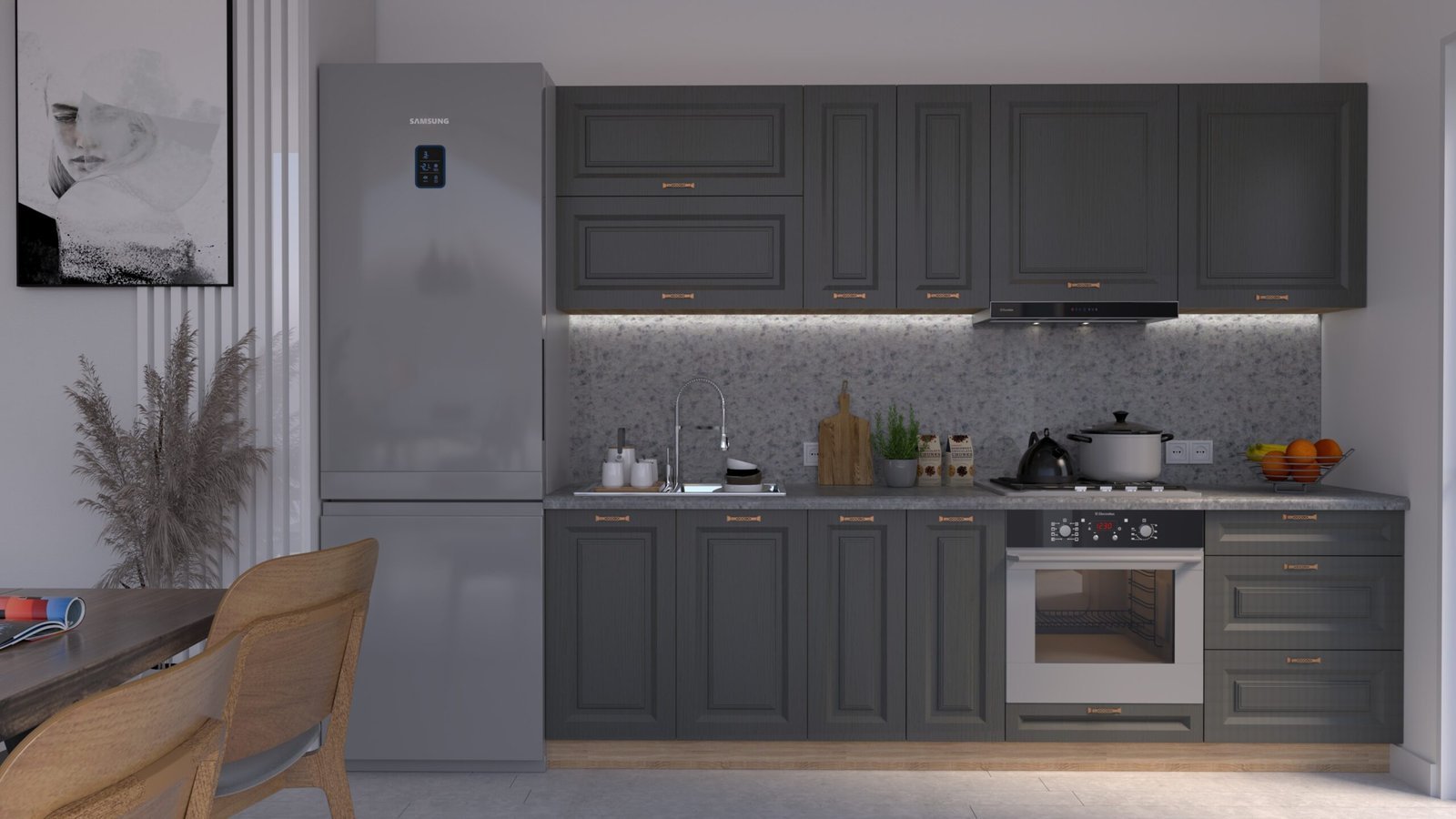 Accesorii incluse: carcase, fronturi, mânere, blat de lucru, feronerie cu închidere amortizată, picioare reglabile și plintă (H=100 mm).