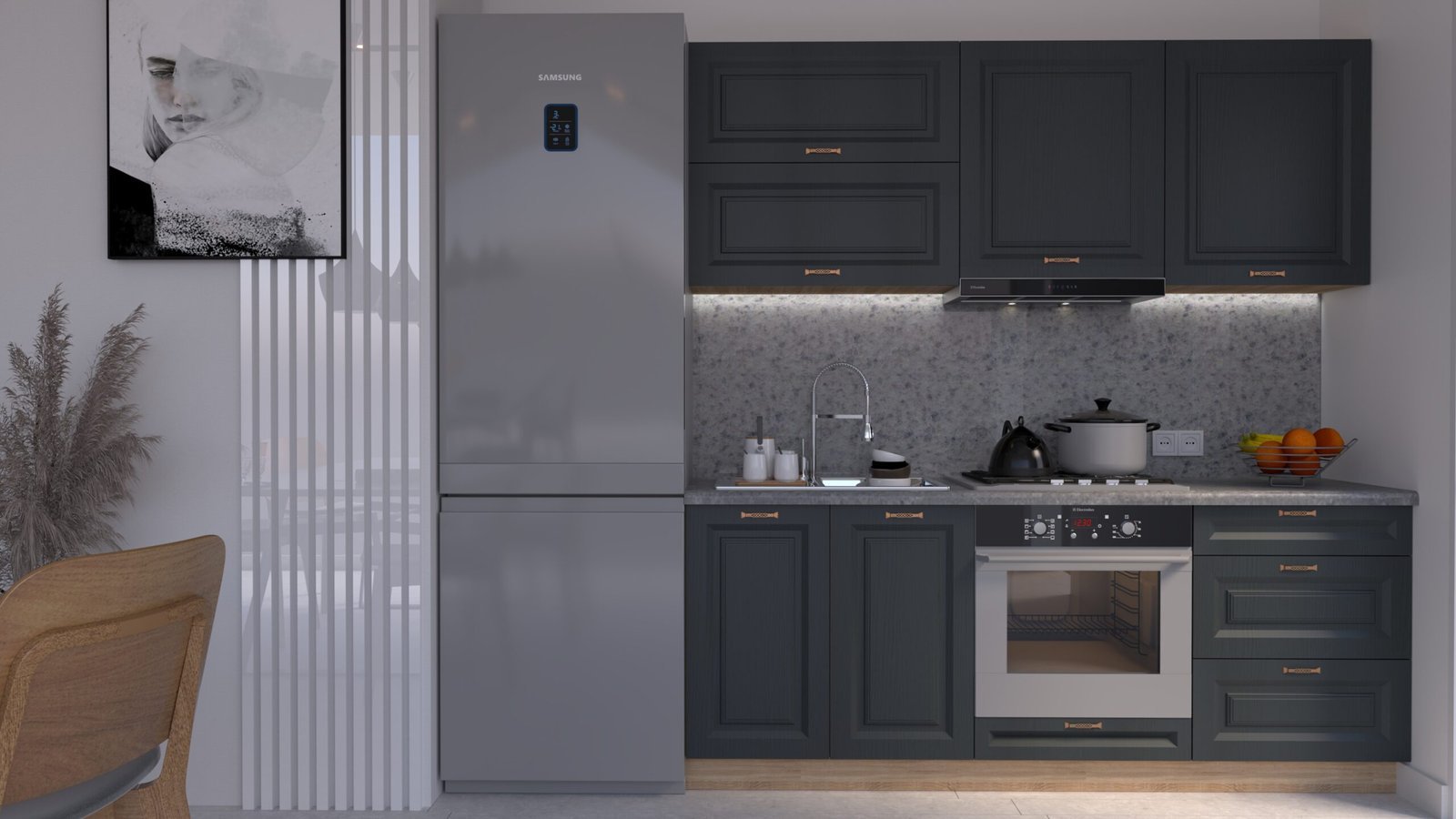Accesorii incluse: carcase, fronturi, mânere, blat de lucru, feronerie cu închidere amortizată, picioare reglabile și plintă (H=100 mm).