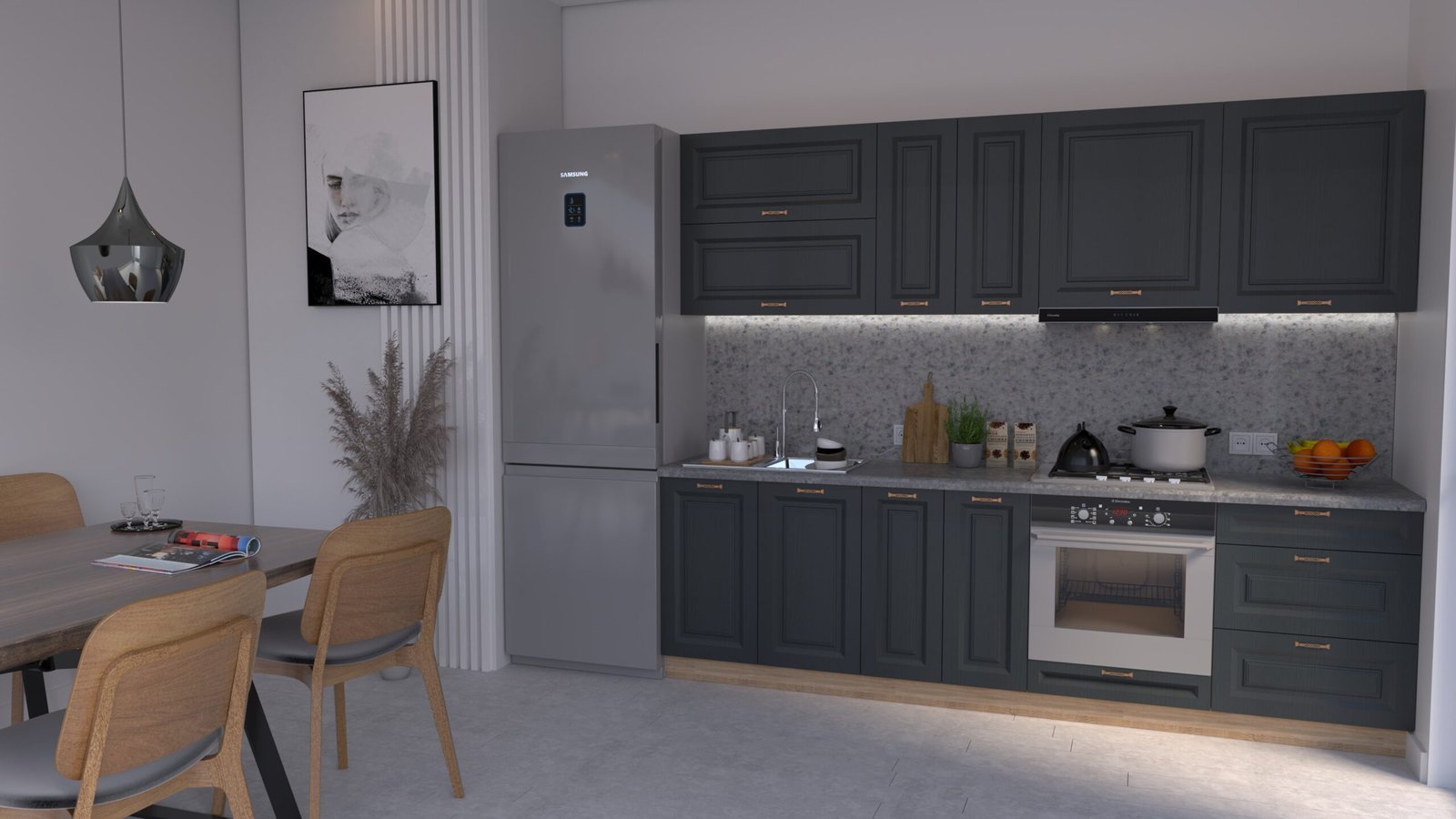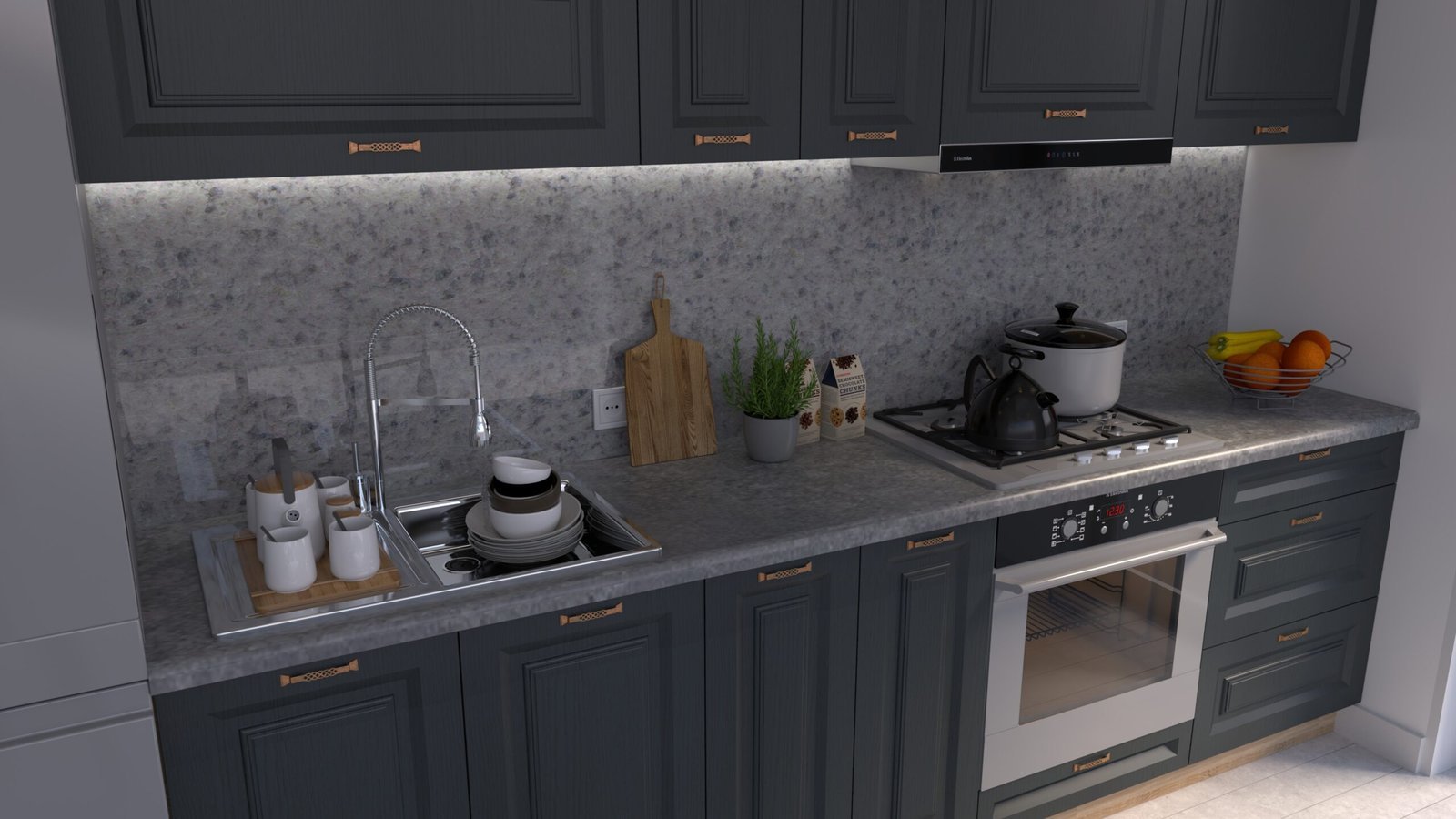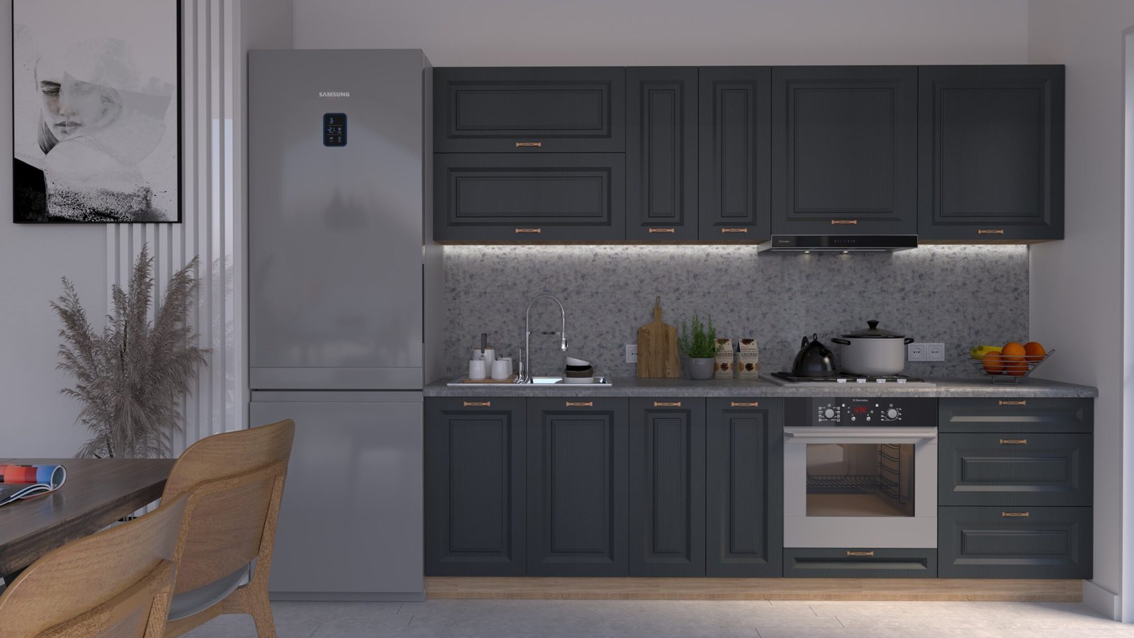 Accesorii incluse: carcase, fronturi, mânere, blat de lucru, feronerie cu închidere amortizată, picioare reglabile și plintă (H=100 mm).