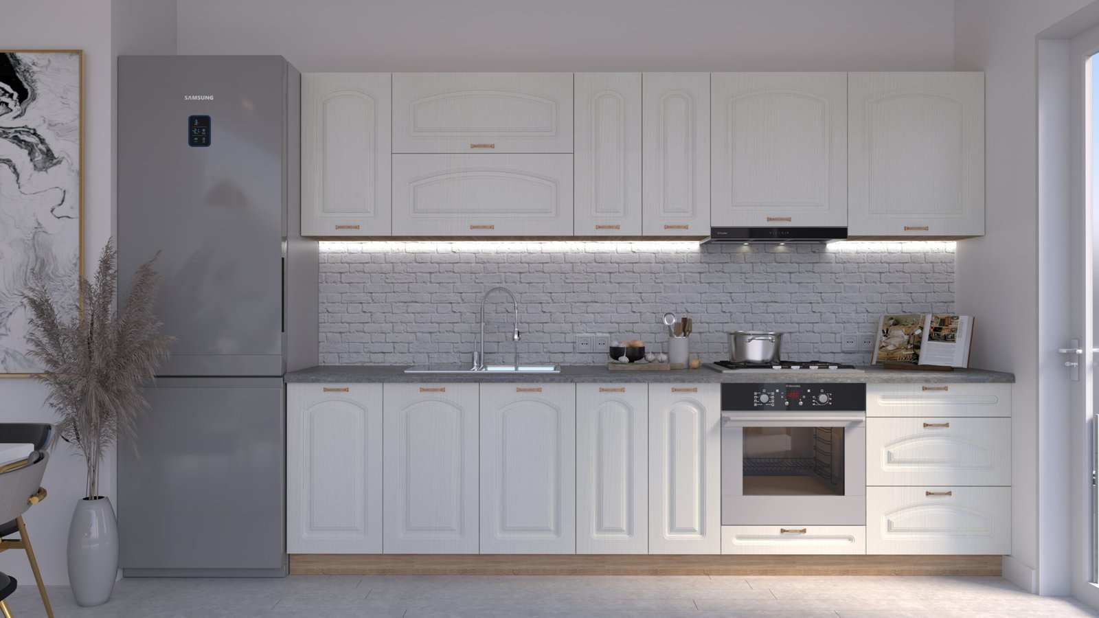 Accesorii incluse: carcase, fronturi, mânere, blat de lucru, feronerie cu închidere amortizată, picioare reglabile și plintă (H=100 mm).