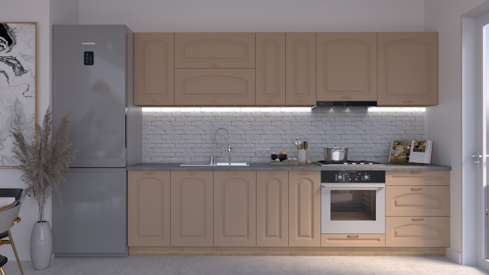 Accesorii incluse: carcase, fronturi, mânere, blat de lucru, feronerie cu închidere amortizată, picioare reglabile și plintă (H=100 mm).