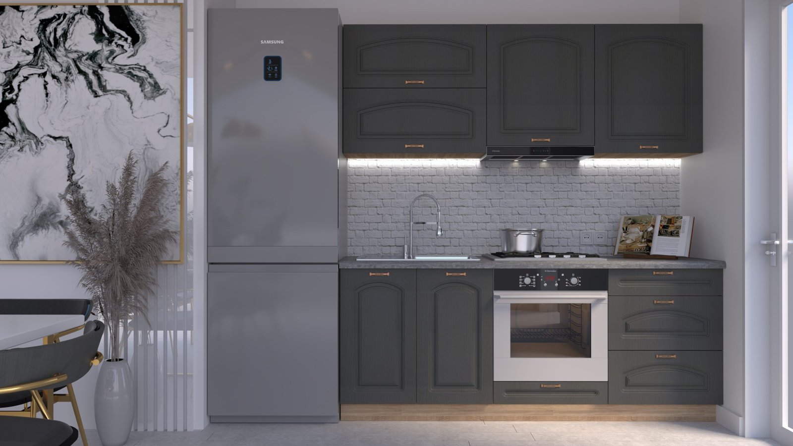 Accesorii incluse: carcase, fronturi, mânere, blat de lucru, feronerie cu închidere amortizată, picioare reglabile și plintă (H=100 mm).