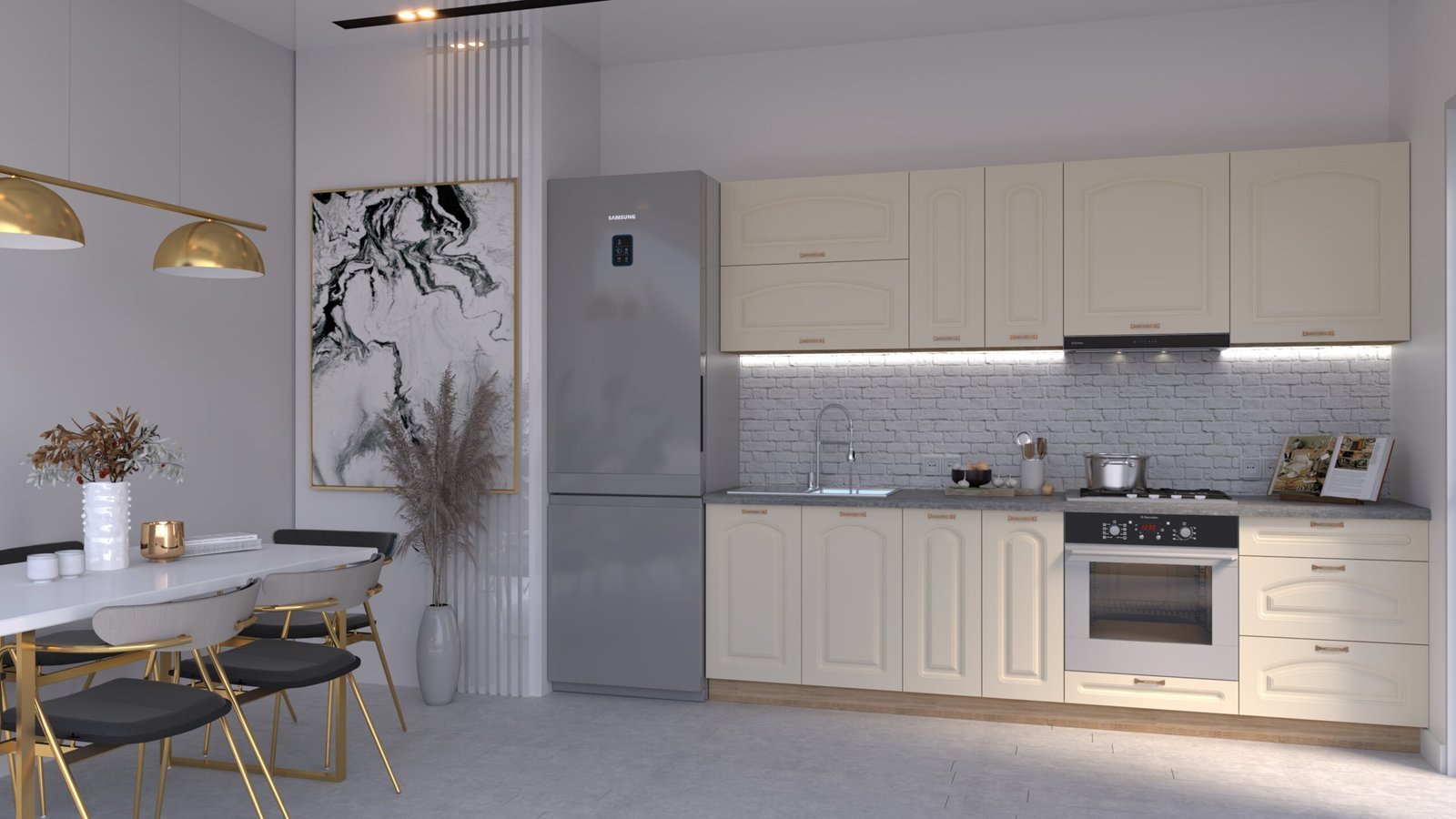 Chiuveta, bateria, electrocasnicele și obiectele decorative nu sunt incluse.