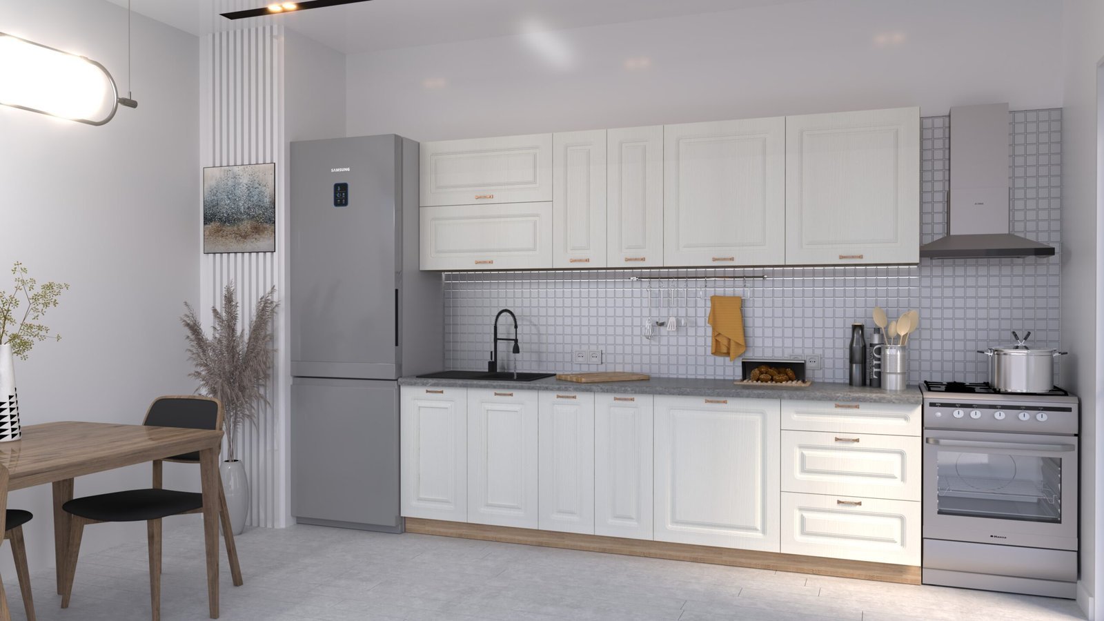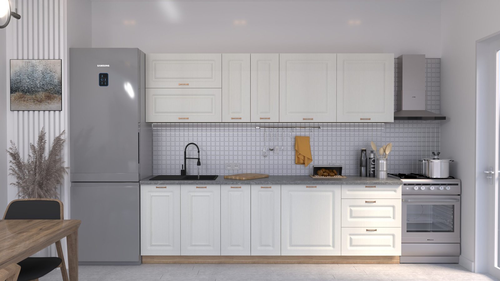 Accesorii incluse: carcase, fronturi, mânere, blat de lucru, feronerie cu închidere amortizată, picioare reglabile și plintă (H=100 mm).