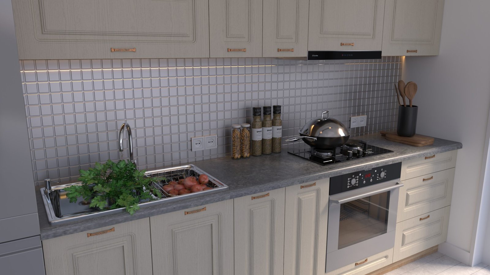 Accesorii incluse: carcase, fronturi, mânere, blat de lucru, feronerie cu închidere amortizată, picioare reglabile și plintă (H=100 mm).