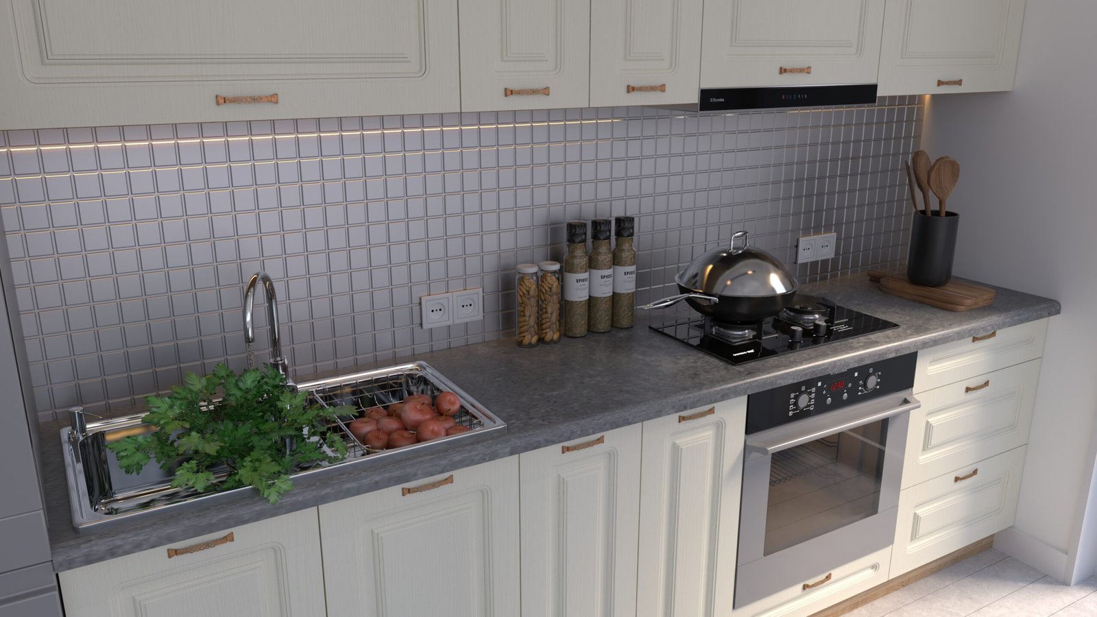 Accesorii incluse: carcase, fronturi, mânere, blat de lucru, feronerie cu închidere amortizată, picioare reglabile și plintă (H=100 mm).