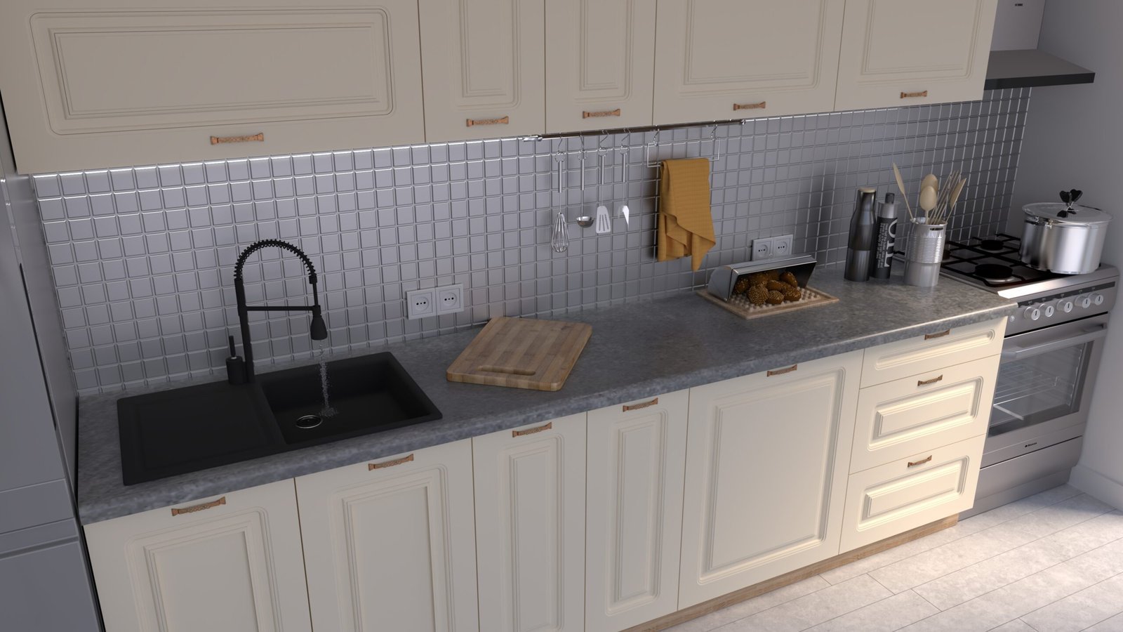 Chiuveta, bateria, electrocasnicele și obiectele decorative nu sunt incluse.