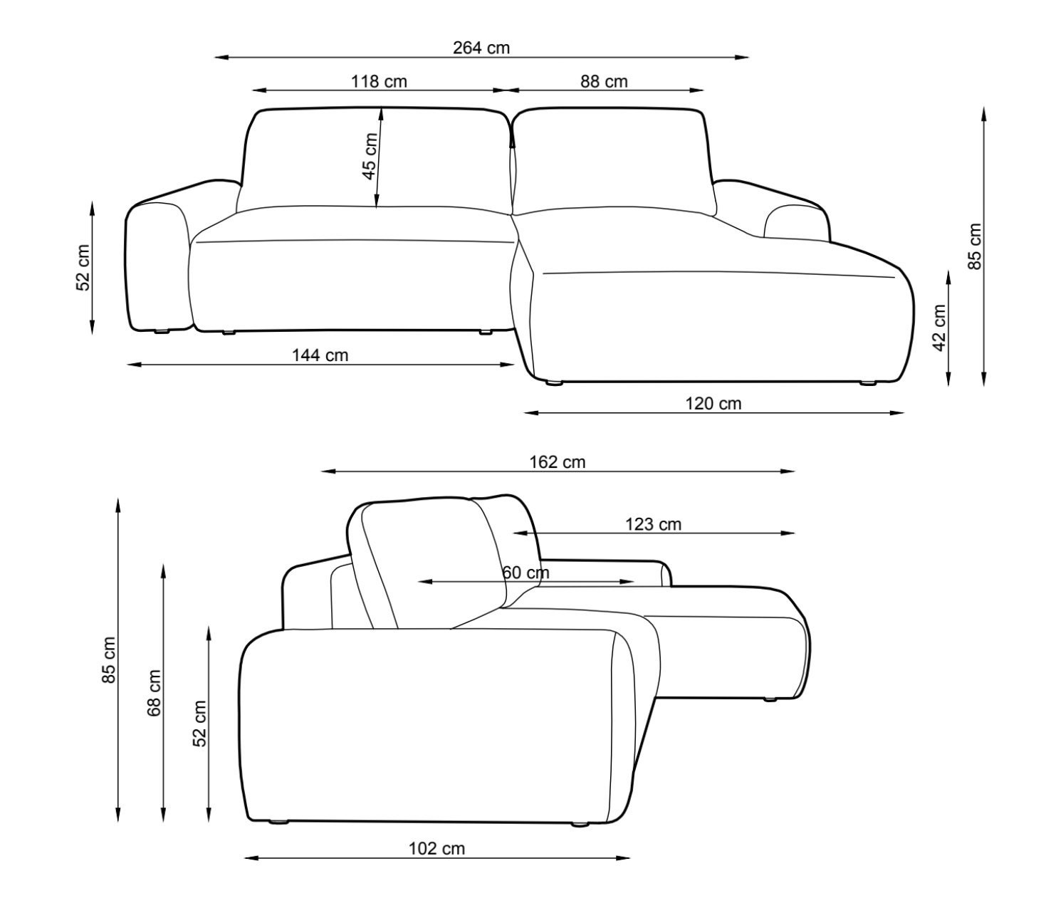 Confortul este susținut de o structură solidă cu spumă de înaltă flexibilitate, așezată pe arcuri sinusoidale plane – o combinație care oferă susținere uniformă și o senzație plăcută de relaxare, zi de zi. Dimensiunile generoase de 264×162 cm și suprafața de dormit de 210×135 cm transformă colțarul într-un spațiu ideal pentru oaspeți sau pentru somn zilnic, datorită mecanismului extensibil ușor de utilizat.