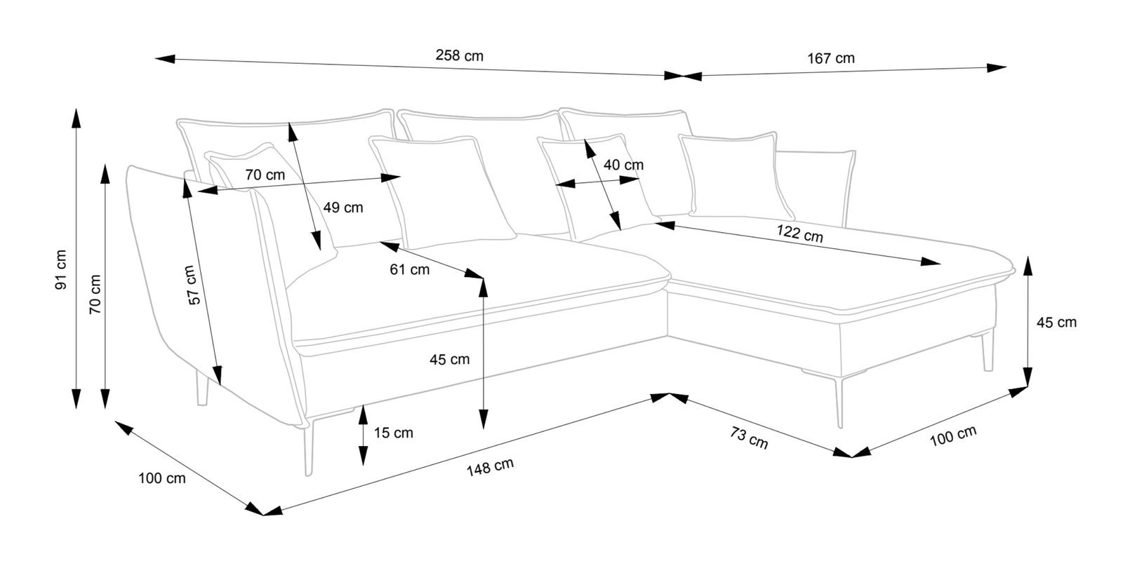 Funcția de extensie tip pat (224×135 cm) este simplu de activat și transformă colțarul într-un loc de dormit confortabil, perfect pentru oaspeți sau seri relaxante. În plus, lada de depozitare integrată te ajută să păstrezi ordinea ușor – fiind locul ideal pentru pături, lenjerii sau perne în plus.