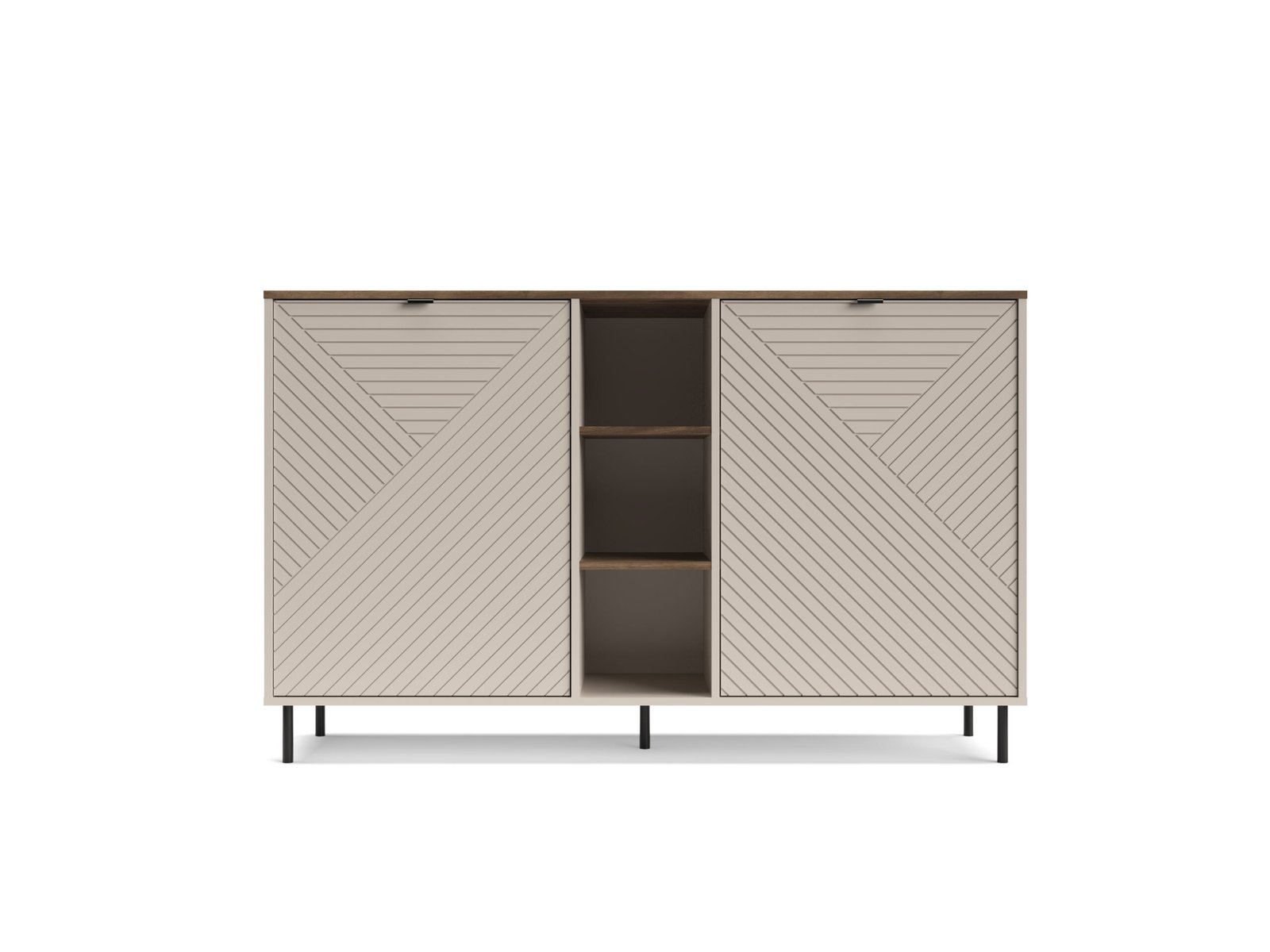 Realizată din PAL cu fronturi din MDF, colecția Estera oferă un aspect bine definit și o utilizare practică de zi cu zi. Picioarele metalice negre și mânerele în ton contrastant completează designul și adaugă un plus de eleganță discretă.
