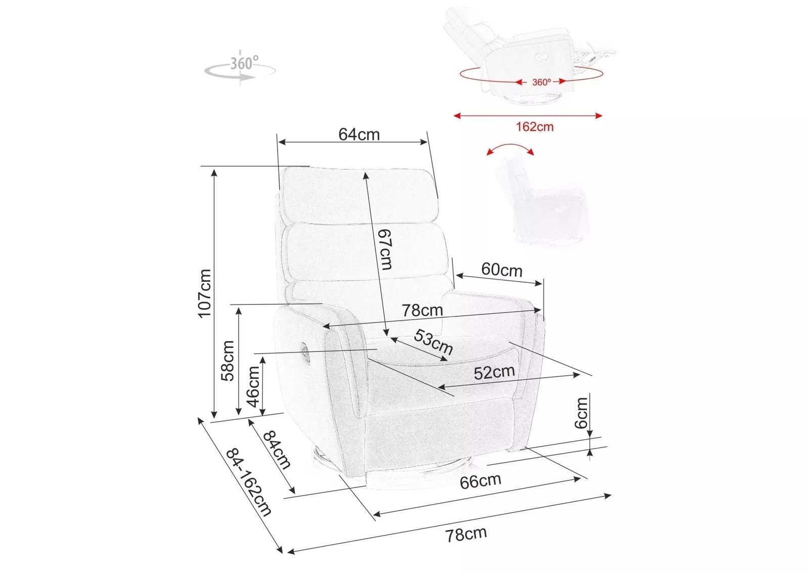 Dimensiuni fotoliu: A – 107 cm, B – 78 cm, C – 46 cm, D – 53 cm, E – 84–162 cm, F – 6 cm