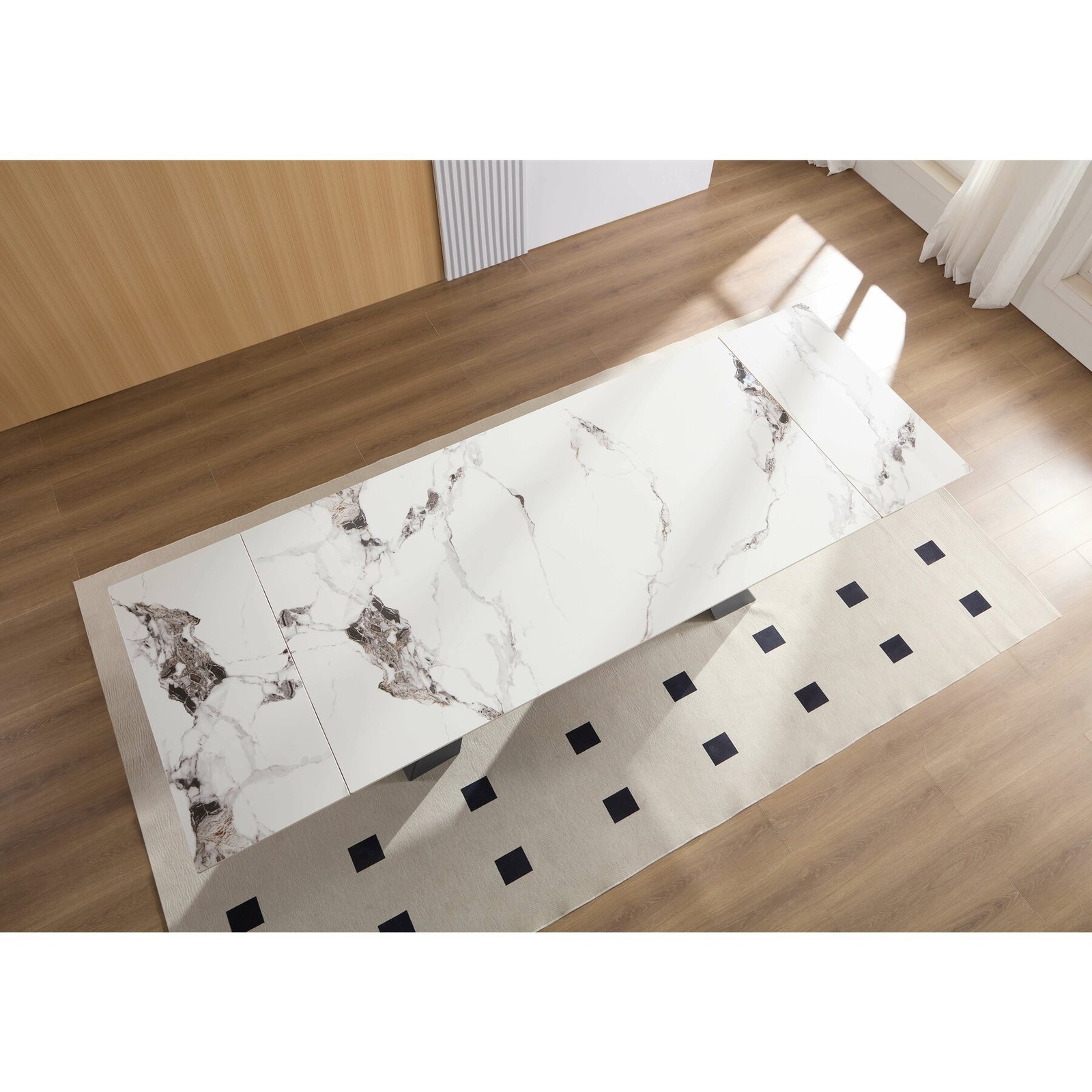 Cromatica sobra, va da un aer modern casei dumneavoastra. Aceasta masa se remarca prin imbinarea armonioasa dintre forma abstracta a picioarelor si blatul realizat din piatra sinterizata – este un material relativ nou care se remarca prin rezistența ridicată la pete, mucegai sau alte bacterii si usurinta prin care se curata. Faptul că este un material neporos, îi conferă o rezistență mai mare la uzura în timp. Piatra sinterizată este complet impermeabilă și este rezistentă la substanțe alcaline, si abraziuni foarte adânci. De asemenea, nu este afectată de razele UV, ceea ce menține finisajul și culoarea originală.