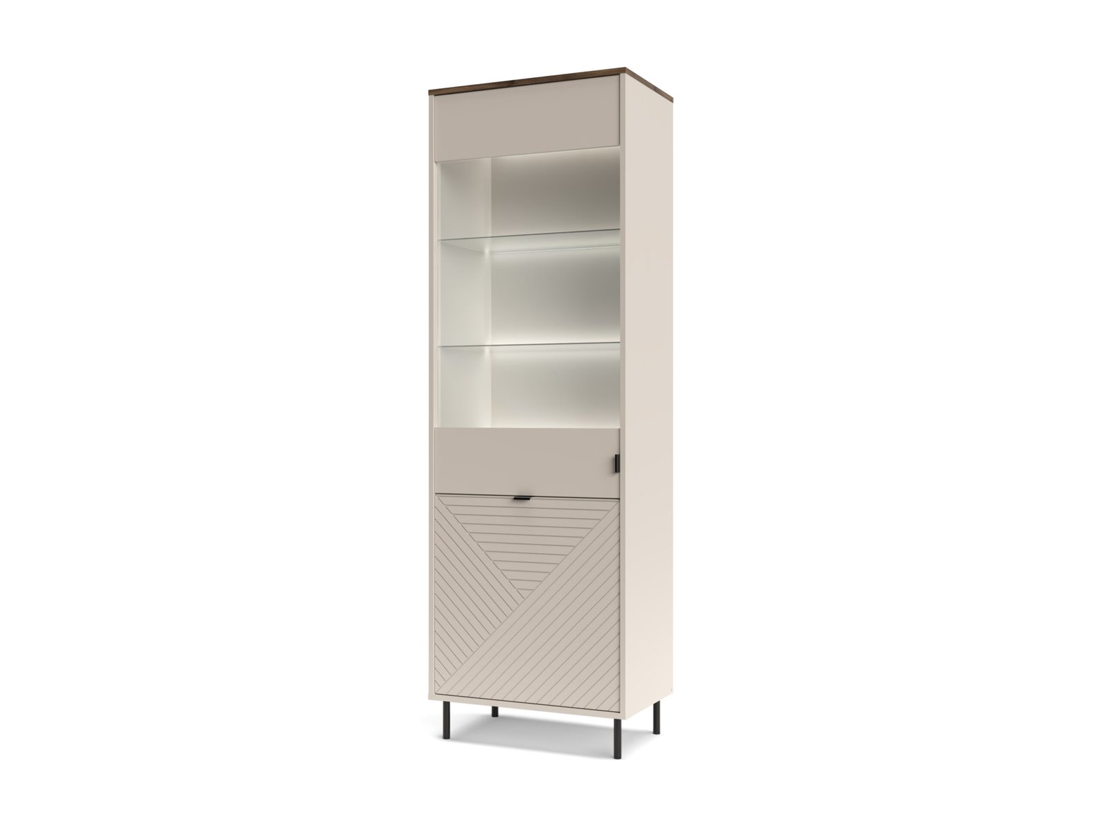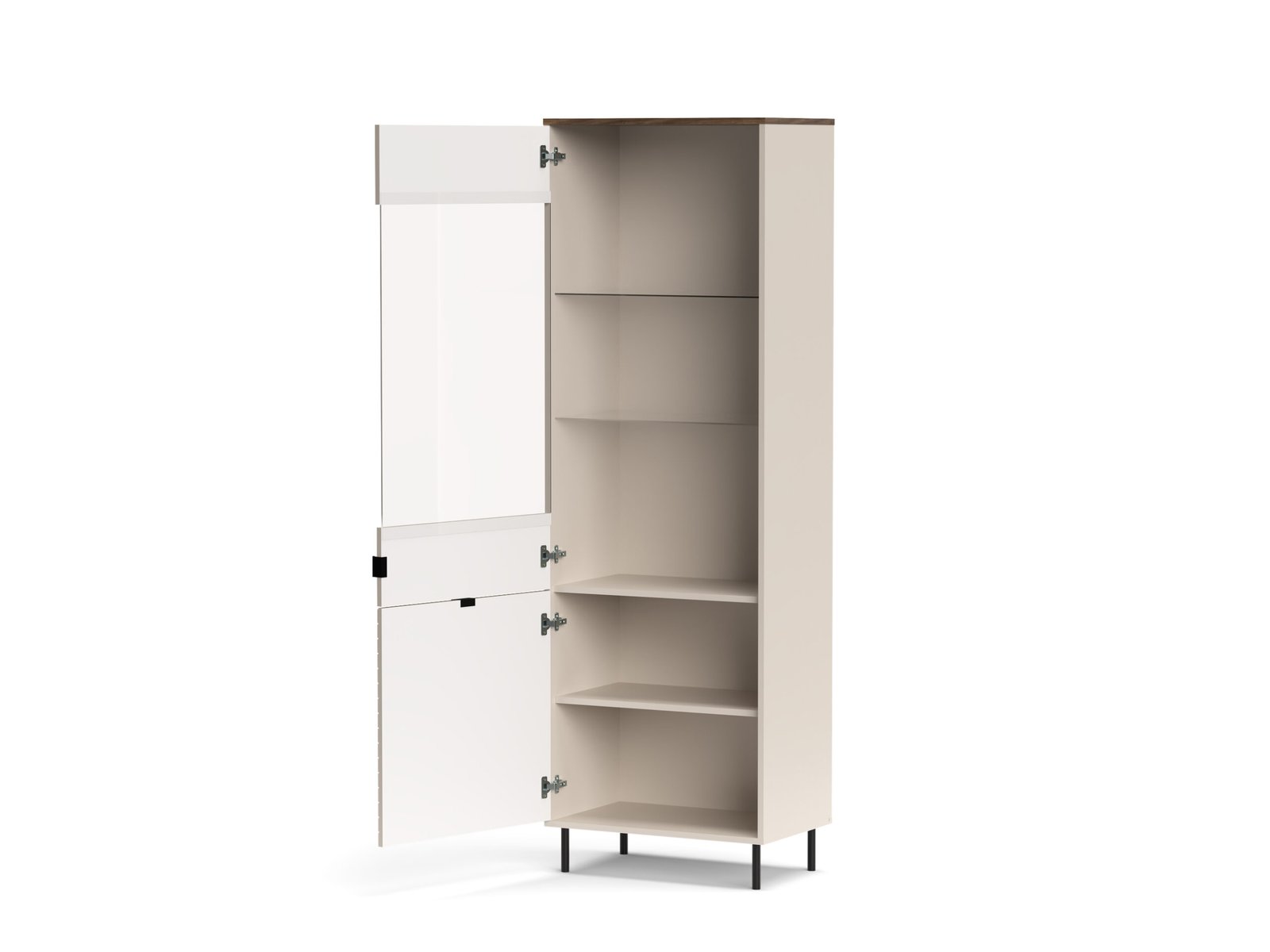 Realizată din PAL cu fronturi din MDF, colecția Estera oferă un aspect bine definit și o utilizare practică de zi cu zi. Picioarele metalice negre și mânerele în ton contrastant completează designul și adaugă un plus de eleganță discretă.